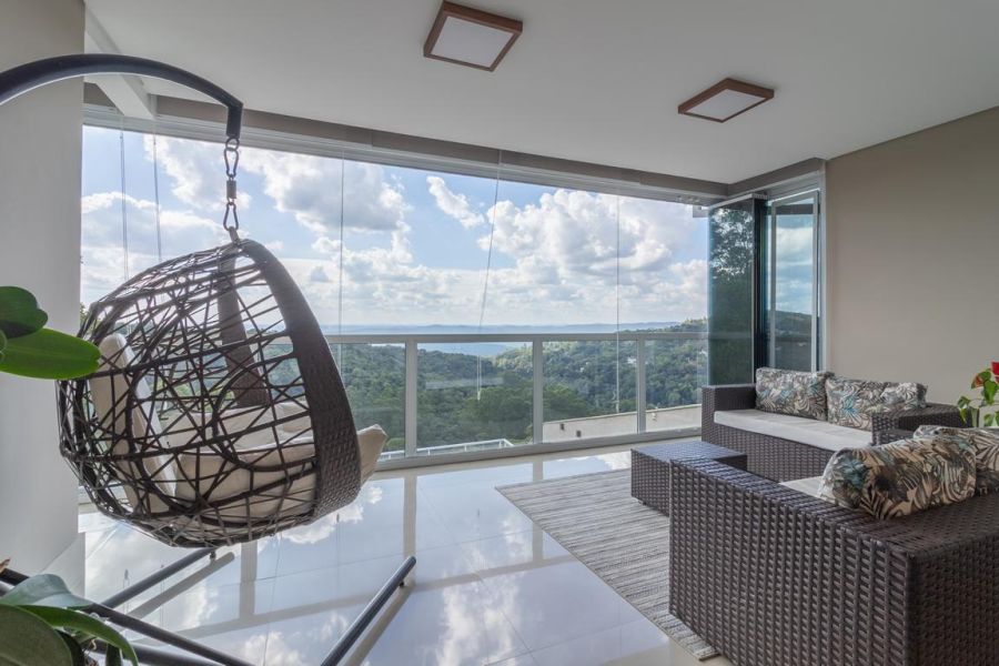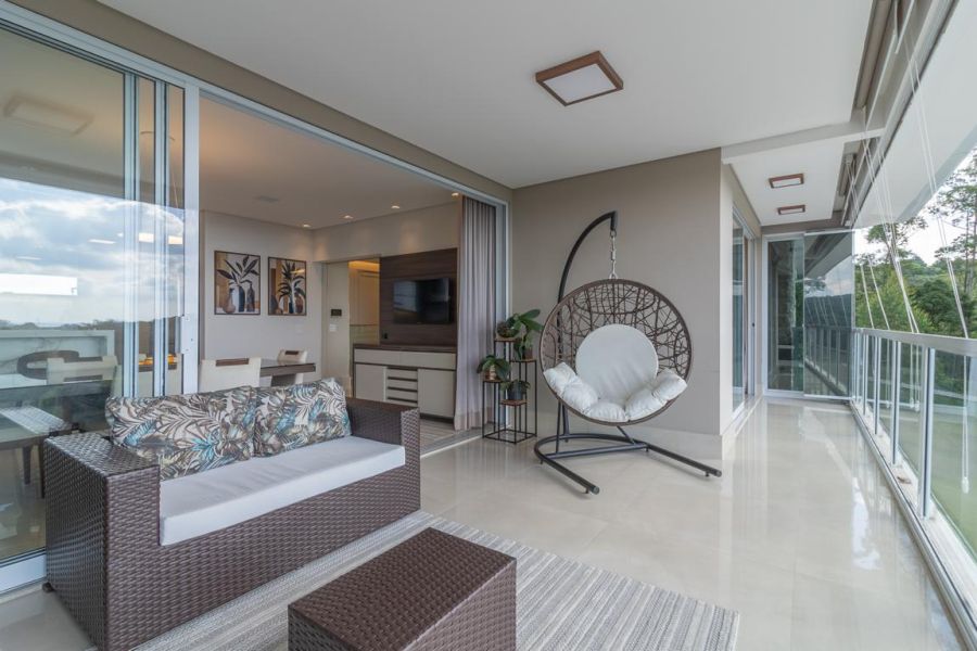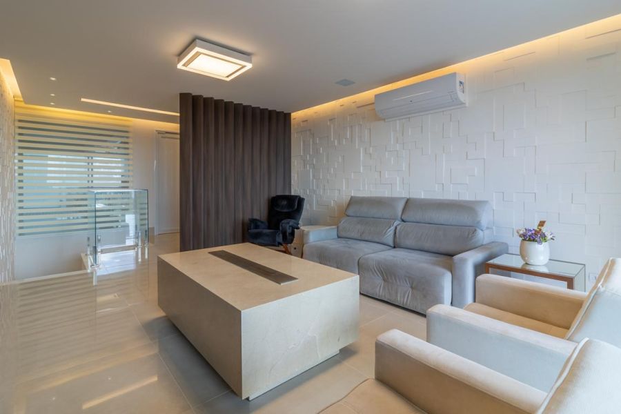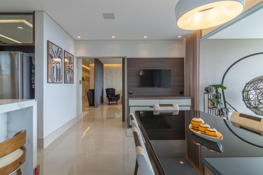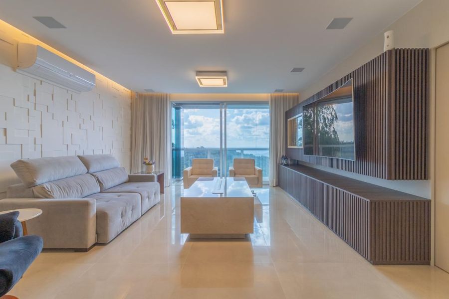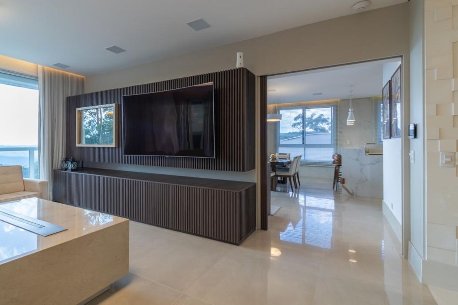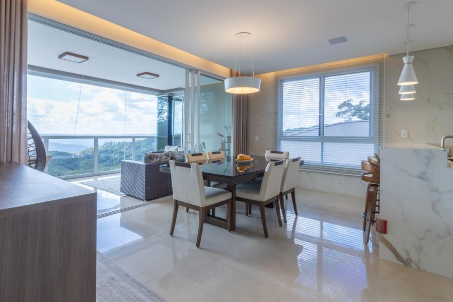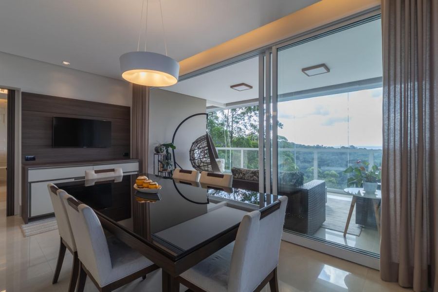 A área social impressiona pelo conceito aberto e integração total: living com lareira ecológica, acabamento em mármore nobre, painel decorativo com bar embutido e sistema de som ambiente. O espaço se conecta à varanda envidraçada, revelando uma vista panorâmica permanente para as montanhas e a piscina.