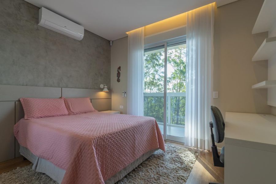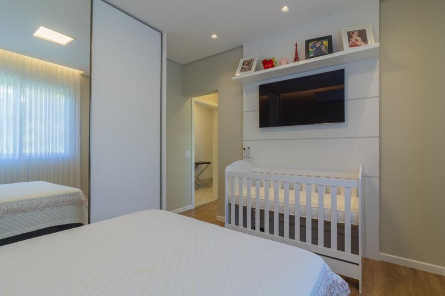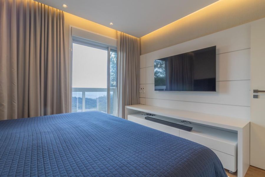 No piso principal, são 3 suítes espaçosas, incluindo uma suíte master com closet em vidro reflecta bronze e varanda com vista aberta para a natureza. Todos os dormitórios possuem móveis planejados, ar-condicionado inverter e TVs inteligentes. Os banheiros seguem um padrão refinado, com acabamentos de alto nível e design atual.