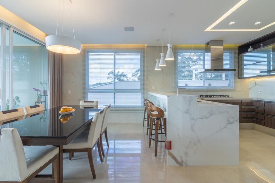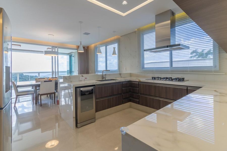 A cozinha americana é completa e elegante, equipada com eletrodomésticos premium e excelente distribuição, além de despensa funcional. O imóvel também conta com um home office planejado, ideal para quem trabalha em casa com conforto e produtividade.