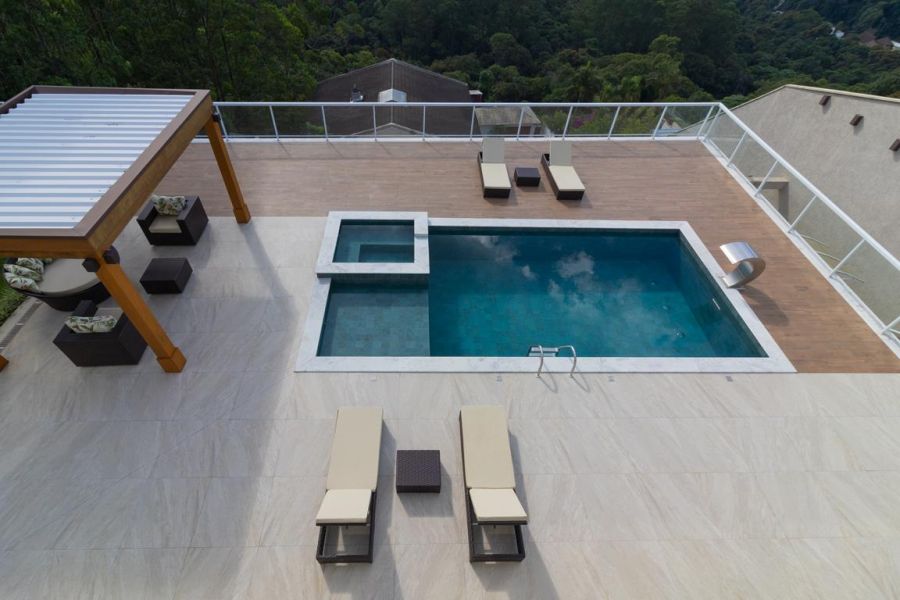 • Piscina com aquecimento solar, spa com automação via aplicativo e cascata independente